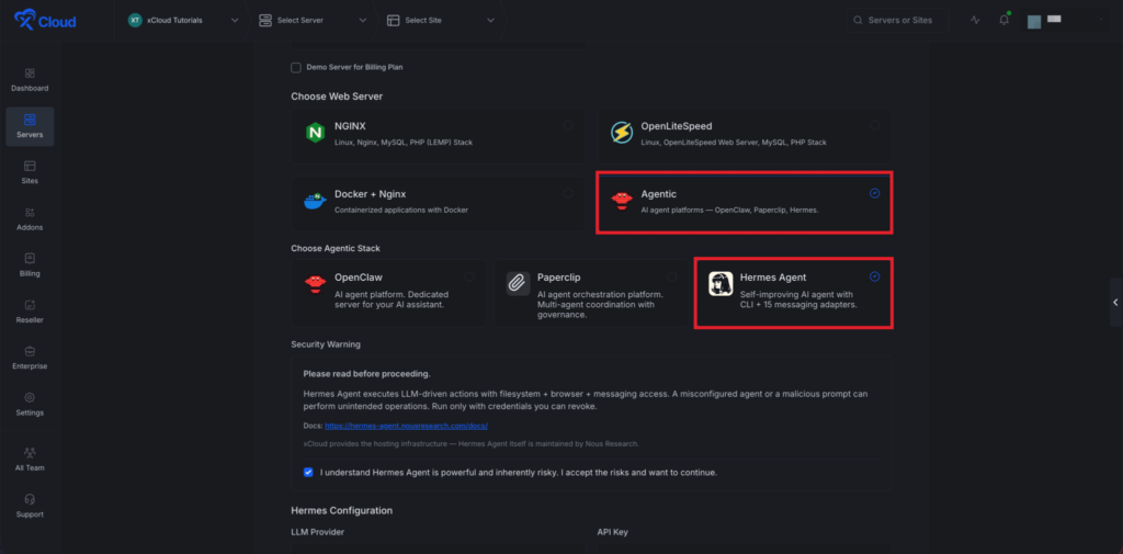 With xCloud, deploying Hermes Agent is as simple as signing up, choosing your region, and adding your API keys. Everything runs on xCloud’s managed servers, so the entire stack, from provisioning, SSL, to gateway setup, is taken care of for you. Here’s how to get started:”