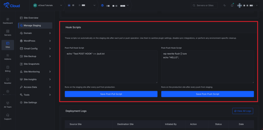 Add your own Post-Pull and Post-Push scripts from the Staging Management page. These scripts run automatically after each pull or push, so you can execute custom bash commands without manual work.