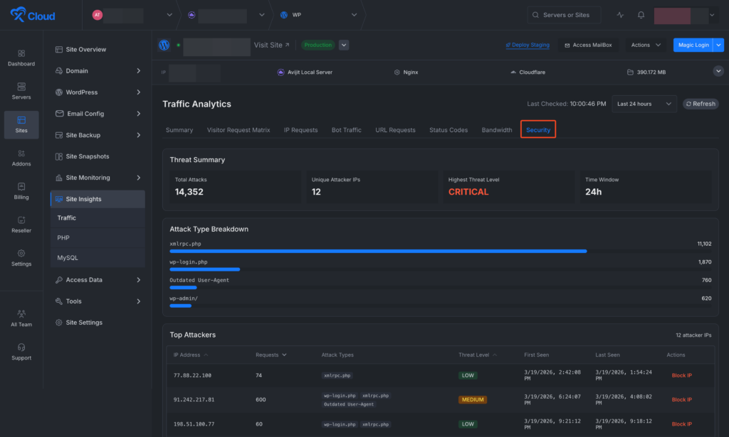 A new Security tab inside Site Insights that parses NGINX/OLS access logs to detect and surface active attacks on your WordPress site. Gives site owners instant visibility into malicious traffic and the ability to block threats with a single click — no SSH or manual config needed.