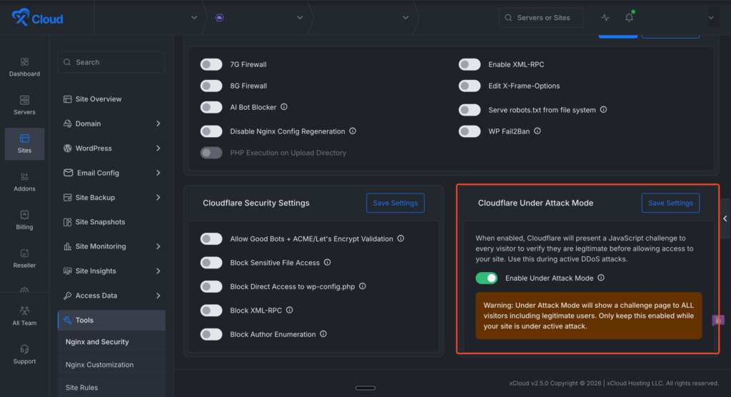 You can now enable or disable Cloudflare’s “Under Attack Mode” directly from the Site security settings page of xCloud dashboard.