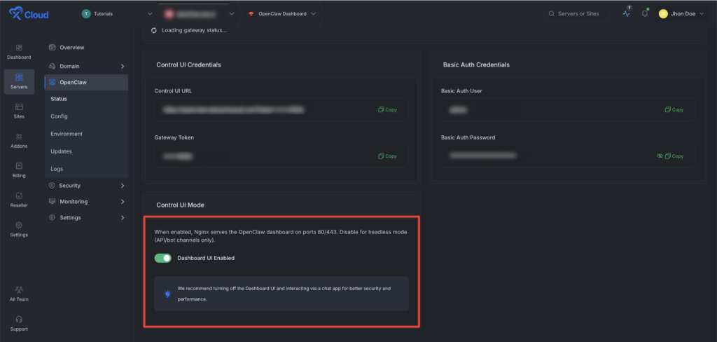 - Control OpenClaw UI turn on/off right from the xCloud dashboard.
