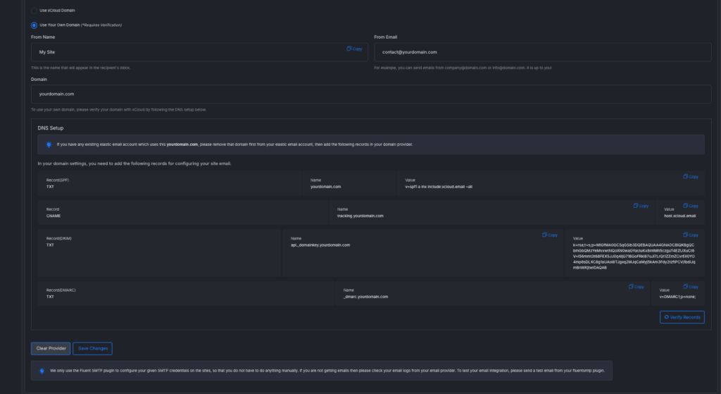 Enter your ‘From Name’, ‘From Email’, and ‘Domain’ in the dedicated fields. After entering the domain, you will need to verify it by adding the following required DNS records in your DNS provider.