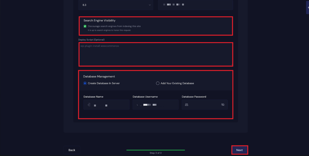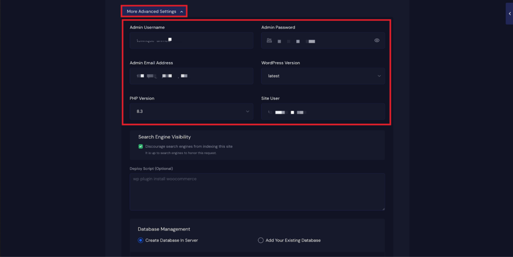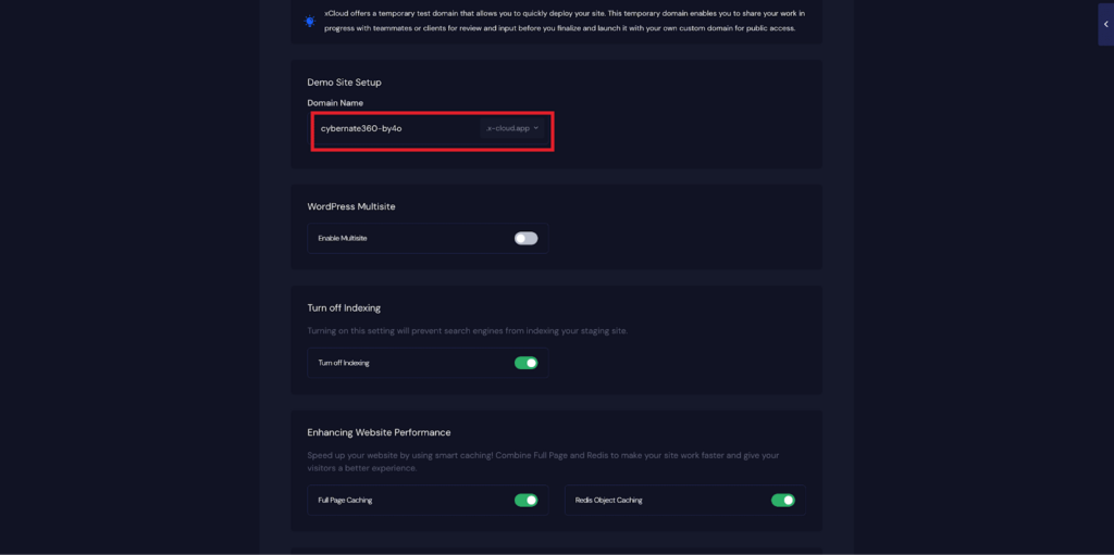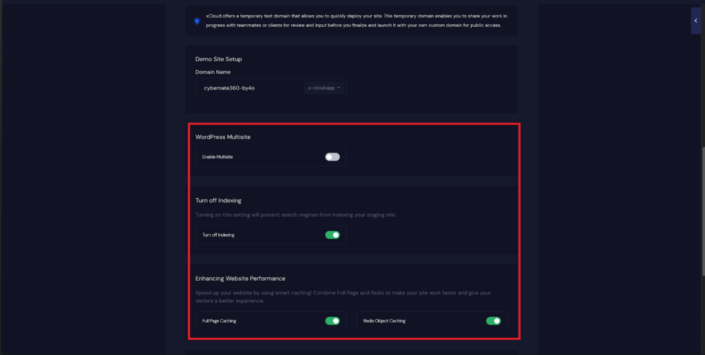 You will also get multiple configuration options, includingโWordPress Multisiteโ, โTurn Off Indexingโ, โFull Page Cachingโ, โRedis Page Cachingโ. Toggle them on according to your preferences.