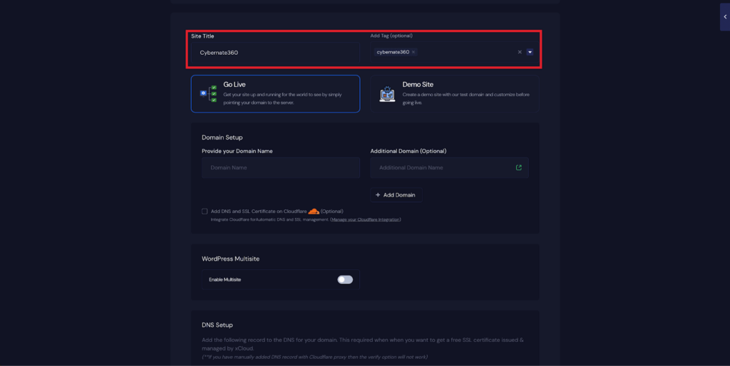 In the site setup screen, you will be prompted to enter basic site information. Provide a โSite Titleโ and add relevant โTagsโ to help organize your deployment.