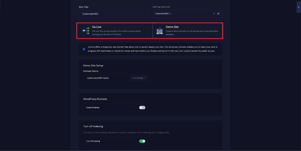 Selecting Go Live will immediately create a live environment, while Demo Site allows you to create a site using a temporary demo domain.