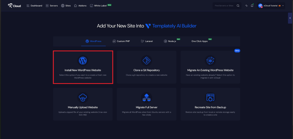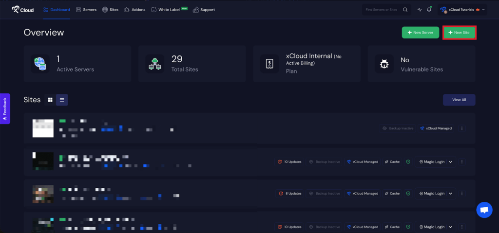 Begin by logging into your xCloud account. Once logged in, navigate to your dashboard and click on the โNew Siteโ button.