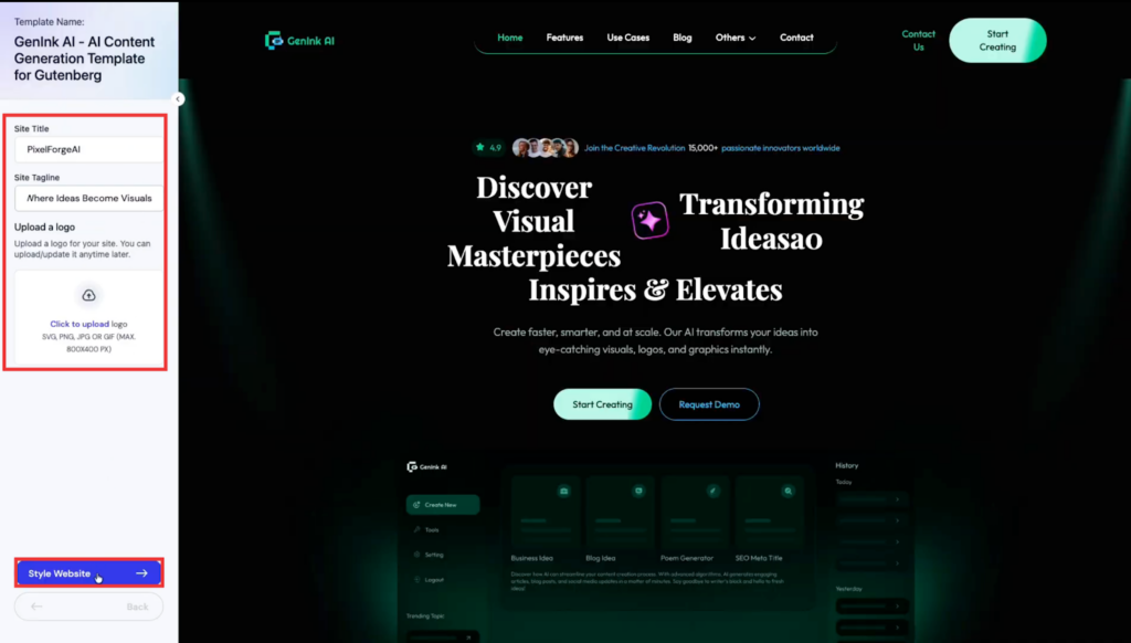 Finally, after completing the process you will see your website will be createdwill created instantly. Here enter your โSite Titleโ, โSite Descriptionโ & โLogoโ and then click on the โStyle Websiteโ.