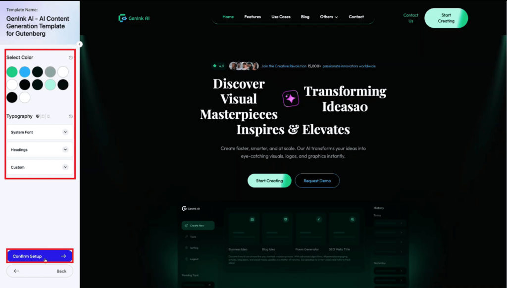 Next, adjust the color and โTypographyโ according to your preferences and click on the โConfirm Setupโ button.