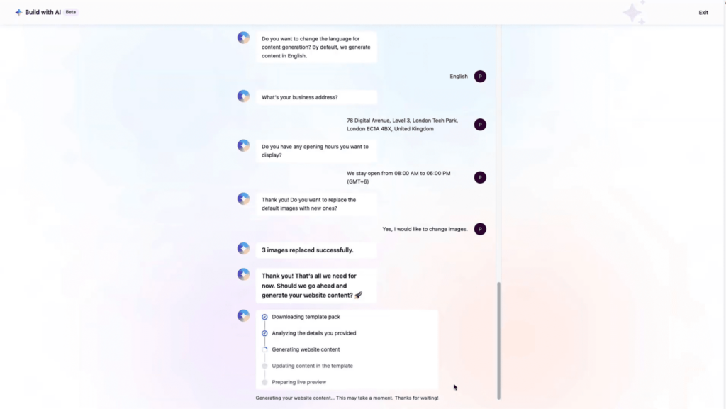 - Business Name: The chatbot will ask, โWhat is Your Business Name?โ. Here, in the answer, type your business name. If you are creating a portfolio website, you can add your name here, too.