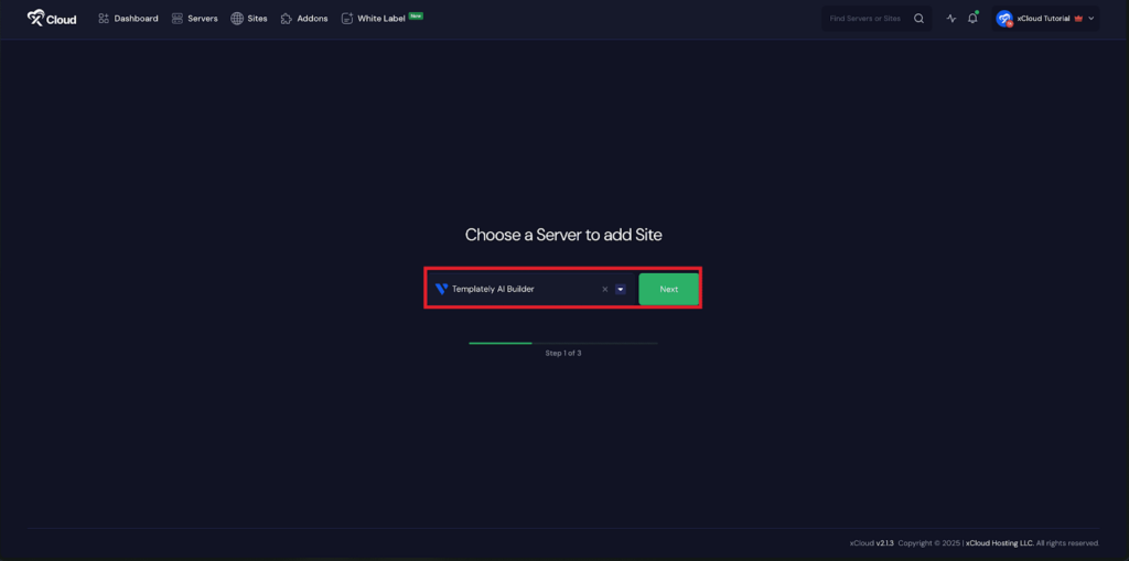 Once your server is connected, you can create a site from the dashboard or Site List by clicking the โCreate New Siteโ button. Then choose your server from the dropdown menu. Next, click on the โNextโ button to proceed.