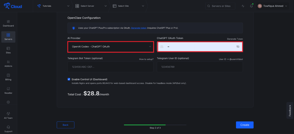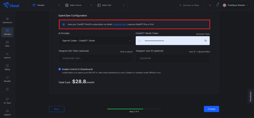 The generated token will be automatically populated into the Codex provider field. Confirm your provider configuration looks correct. Click Create (or Save) to apply the configuration to your OpenClaw server