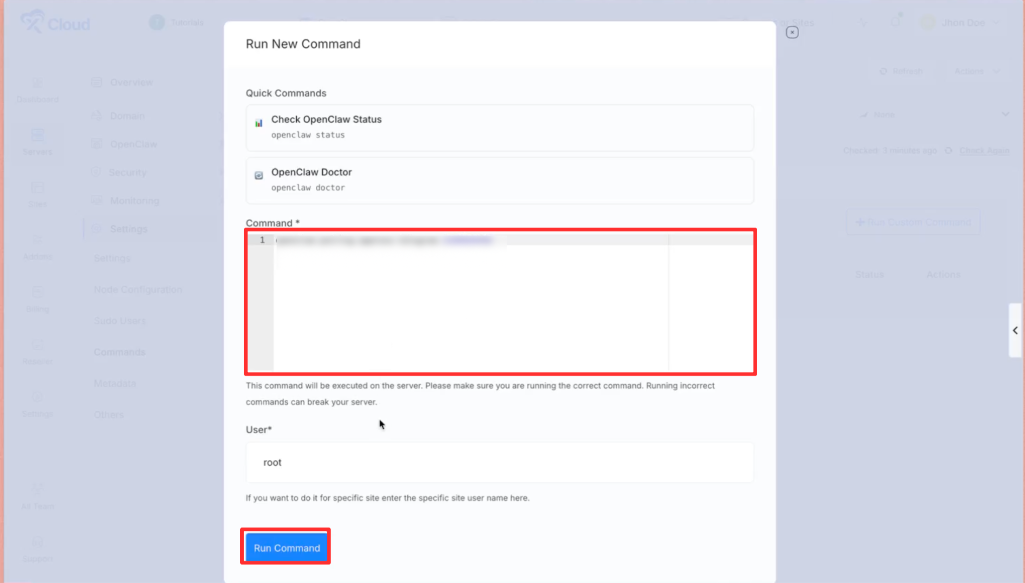 A pop-up will appear, enter the command in the command field, and click on the โRun Command button. And your access configuration will be started.