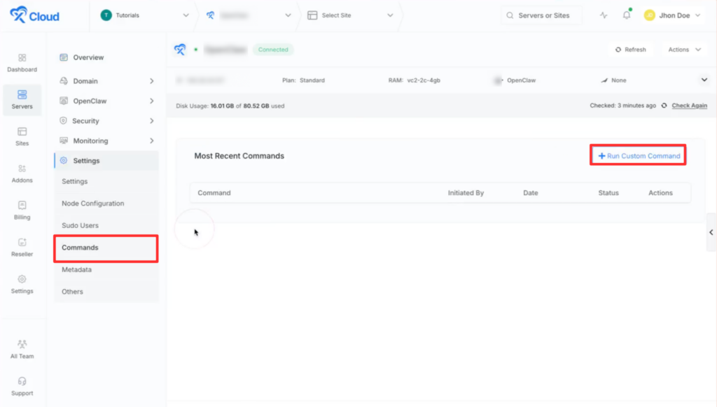 Then go to the xCloud dashboard, find the โCommandsโ from the left menu and click on the โRun Custom Commands from the dashboard.