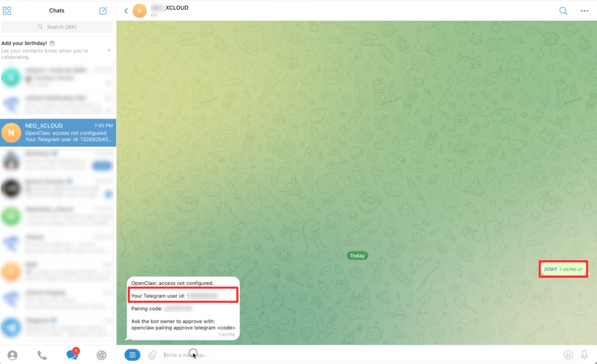 After that, you will get a User ID. Copy the ID from here and copy the text โopenclaw pairing approve telegram <code>โ. Replace the code with the code to enter the user id.