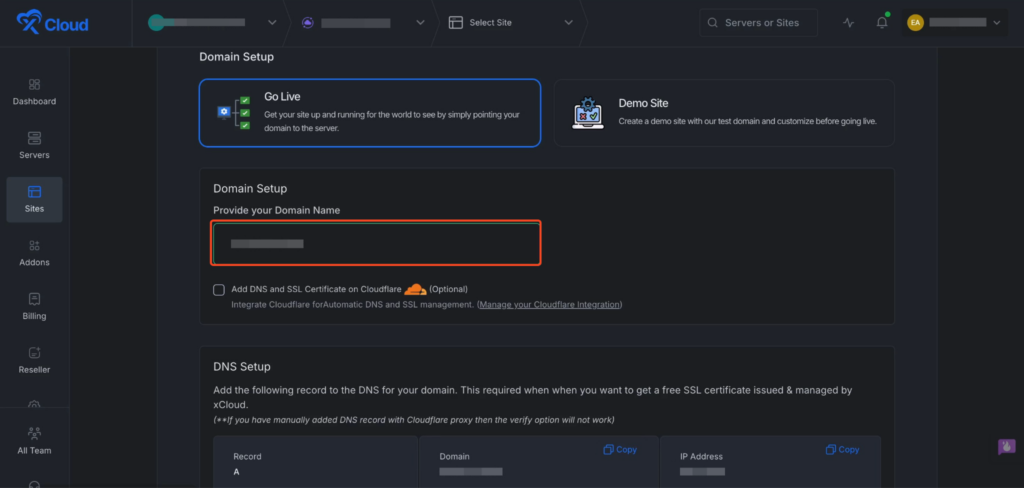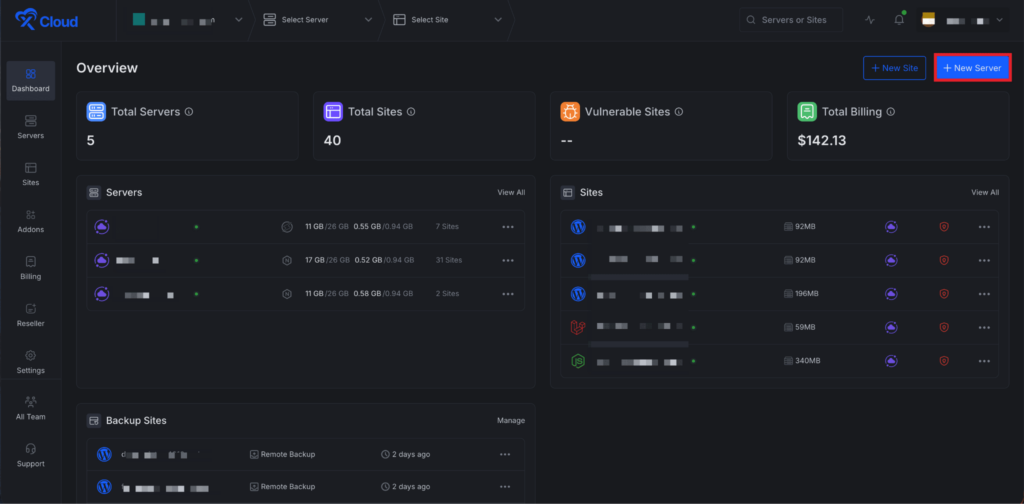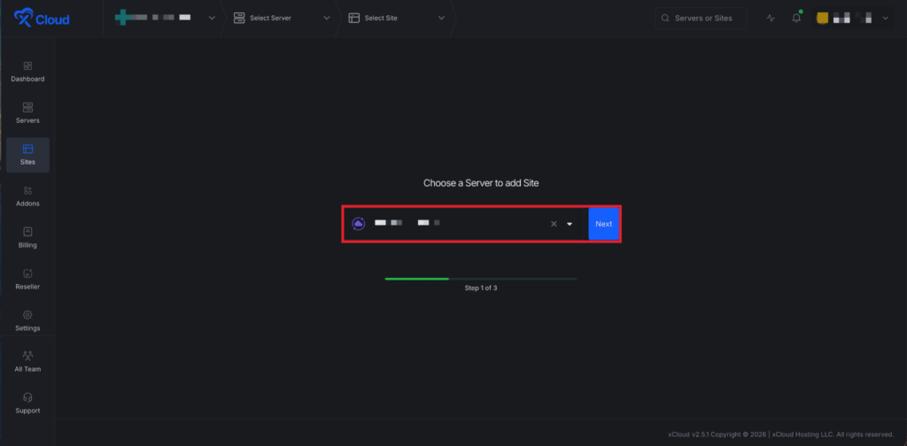 Begin by logging into your xCloud account. Once logged in, navigate to your dashboard and click on the โNew Siteโ button.