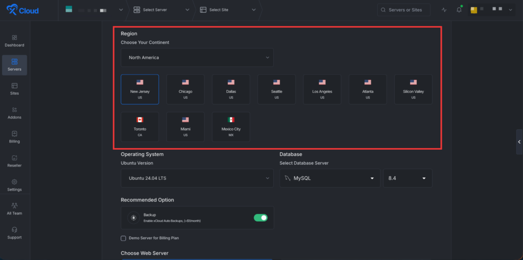 Next, choose the โRegionโ and โUbuntu Versionโ for your server. CHoose the โUbuntu versionโ โDatabase Serverโ as your preferences. You can also enable or disable the Backup option as needed.