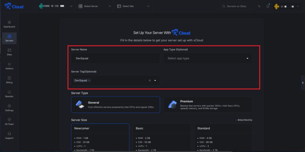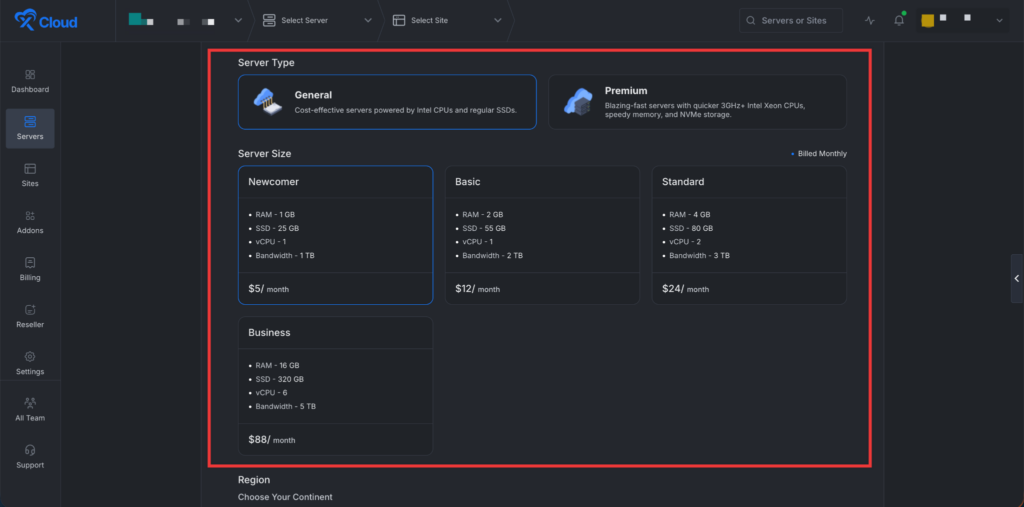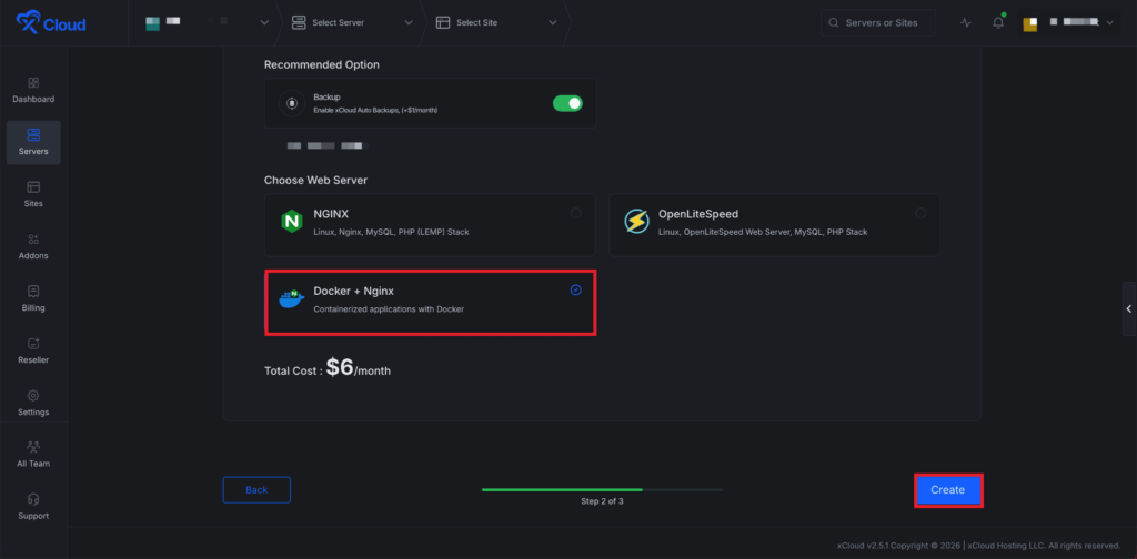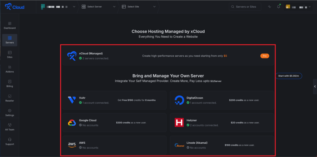 Next, choose your server provider to deploy Custom Docker with xCloud. You can either use an xCloud Managed Server or select your preferred provider. In this guide, weโll use the xCloud Managed Server.