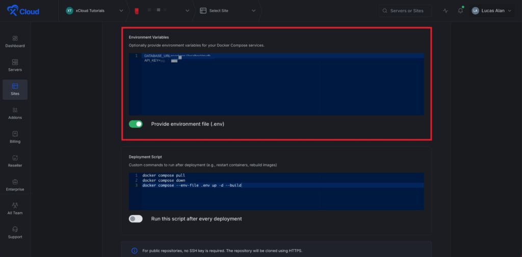 Then toggle on the โEnvironment Fileโ to enable if you want to enter environment variables for your Docker Compose services.
