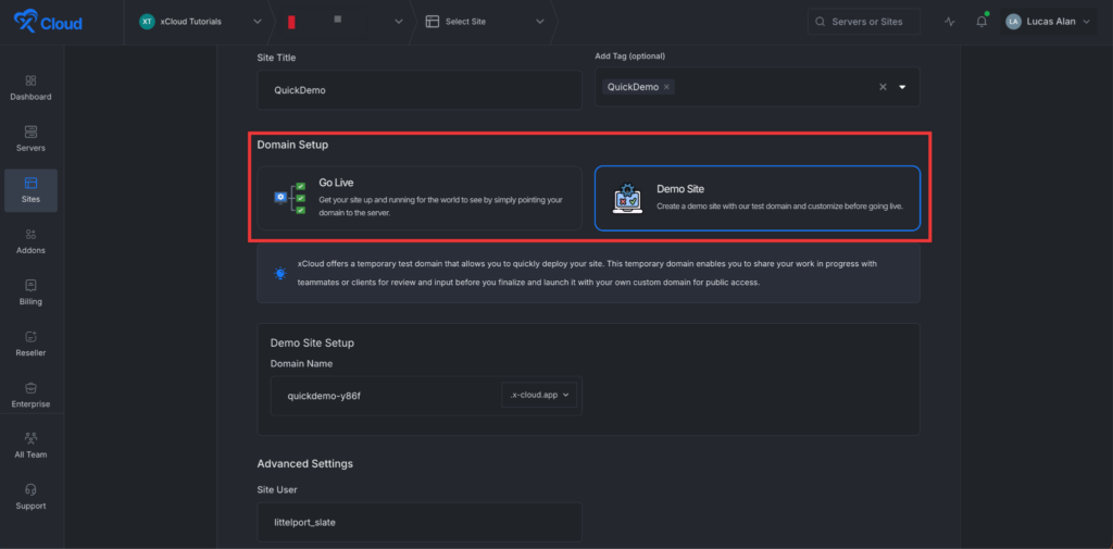 From the โDomainsโ tab, you will get two options: either you can create a โDemo Siteโ with a test domain and refine it until it is ready for launch, or, you can migrate into a new domain to get your site up and running in a new domain.