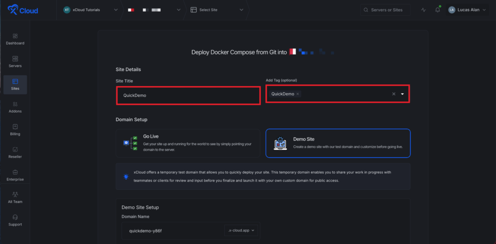 In the site setup screen, you will be prompted to enter basic site information. Provide a โSite Titleโ and add relevant โTagsโ to help organize your deployment.