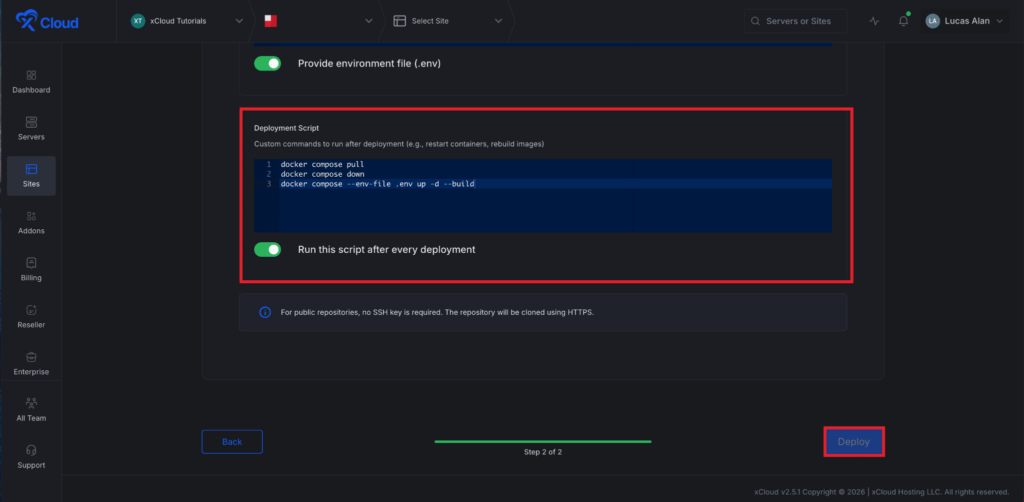 Then, go to the โDeployment script section,. In the โDeployment Scriptโ field, enter any custom commands you want to run after deployment. here you can add custom commands to run after deployment (e.g., restart containers, rebuild images).