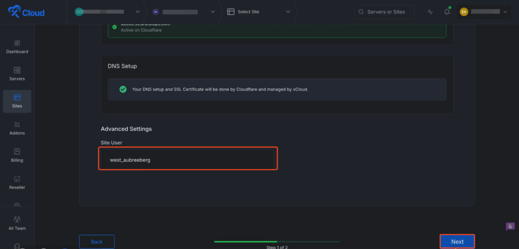 Then you will get a โSite Userโ of xCloud and click on the โNextโ button to proceed.