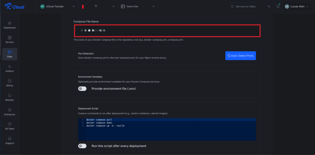 Next enter the name of your Docker Compose file in the repository root โComposer File Nameโ in the dedicated field.