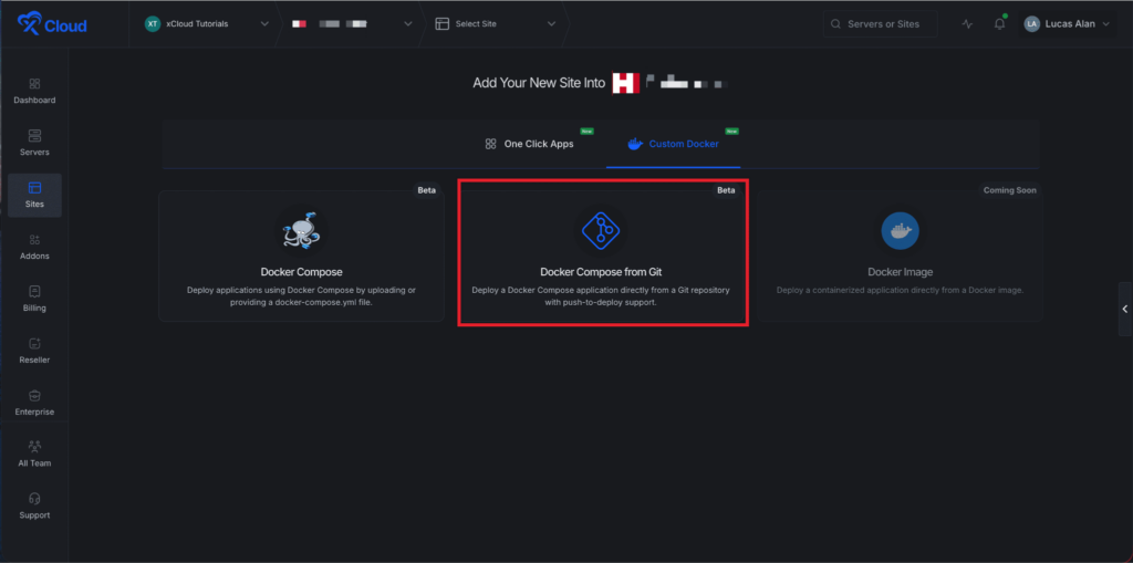 From here, go to the โCustom Dockerโ tab and click on the โDocker Compose From Gitโ to deploy your Custom Docker applications.