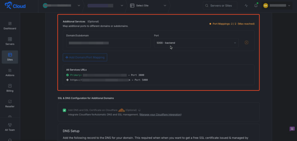 Next under the โAdditional services, you can map for additional ports to different domains or subdomains. Enter the โDomain/Subdomainโ and โPortโ in the dedicated fields.