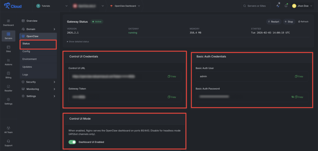 โStatusโ option from the left side menu. Here, you will get the UI credentials and the Auth credentials. Collect the credentials when necessary. From the โControl UI Modeโ, you can toggle ON/OFF the โDashboard UIโย option according to your preferences. If you toggle off, no one will be able to access the UI of the OpenClaw dashboard.
