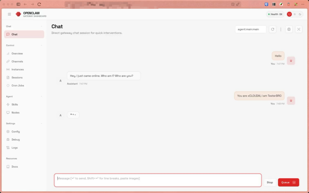 Now if you log in toyour OpenClaw account using the credentials, you will be able to start chatting with OpenClaw.