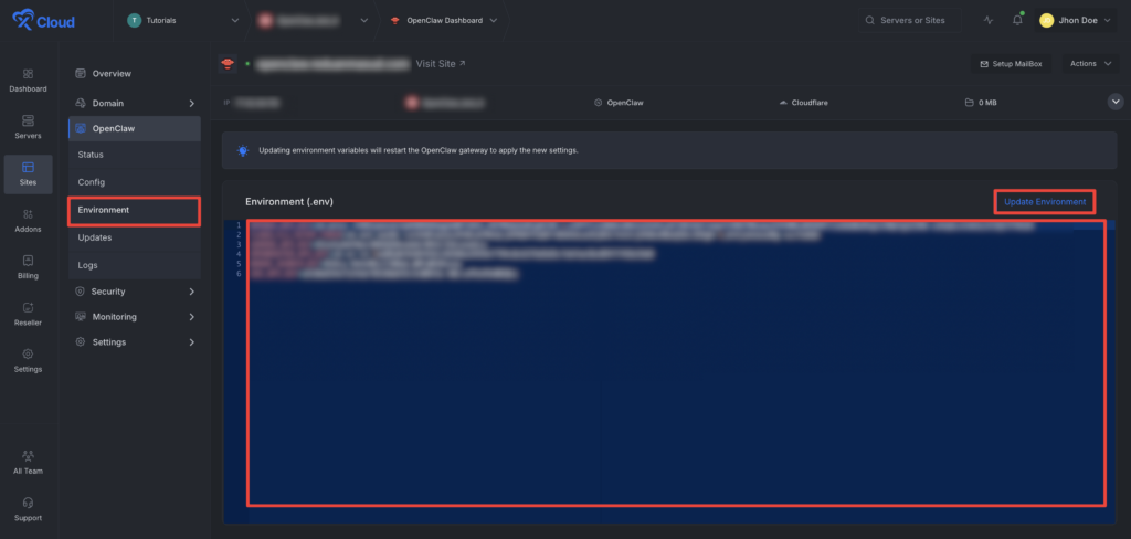 The Environment section in xCloud allows you to customize configuration settings for your OpenClaw instance. Just go to the โEnvironmentโ option from the sidebar and adjust as you needed then click on the โSaveโ button.