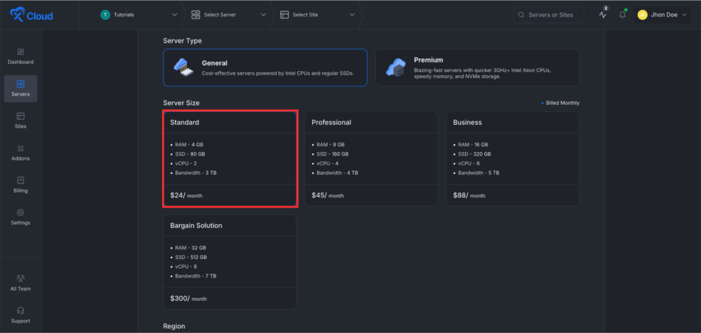 After that, go to the โServer Sizeโ option and choose your preferred server size. Please note that deploying an OpenClaw instance requires a minimum 4GB RAM server.