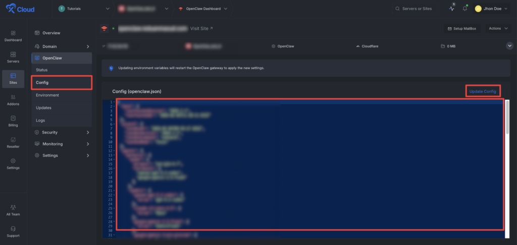 Next, go to the โConfigโ option from the menu and adjust the credentials when needed and click on the update button right from the xCloud dashboard.