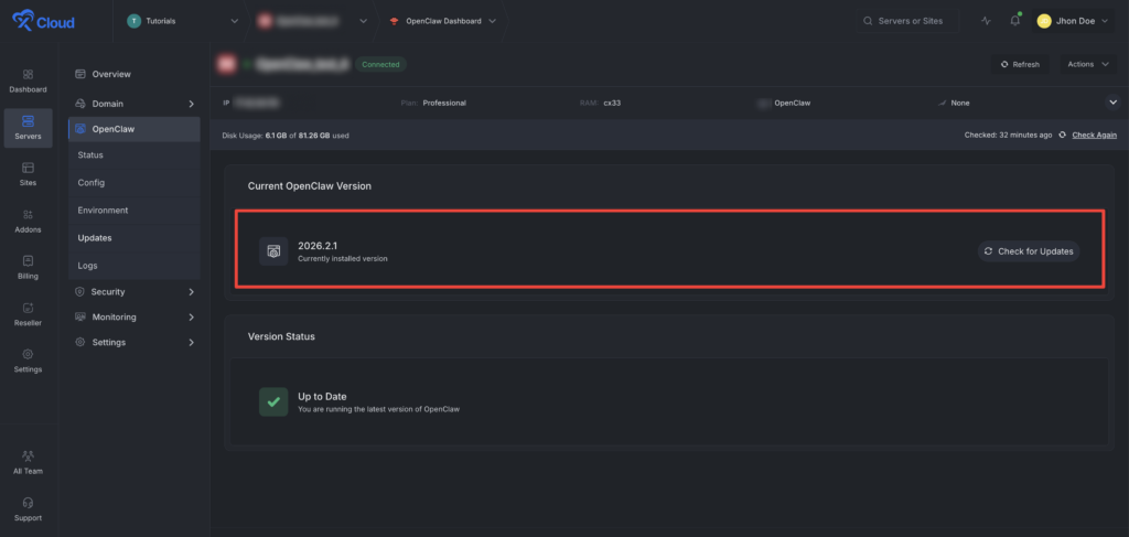 Update the OpenClaw version from the xCloud dashboard. Just go to the โUpdatesโ from the left menu and click on the โCheck for Updatesโ button to see if there are any updates available.