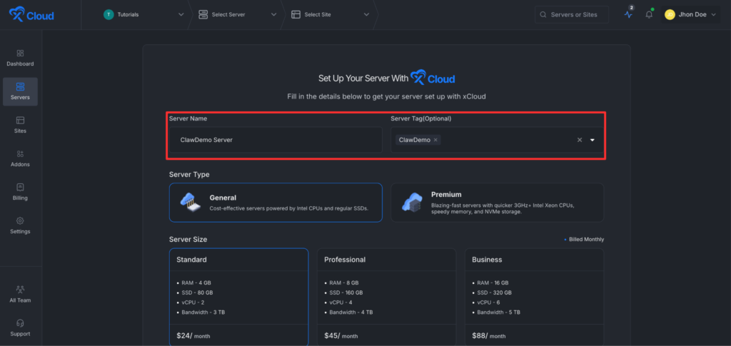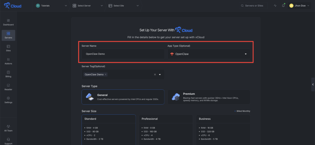 Note: If you create an xCloud Managed Server using the standard server creation flow, select App Type: OpenClaw. xCloud will automatically provision and set up OpenClaw during server creation, just like the One Click App setup.