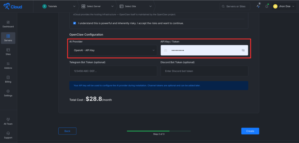 Finally, click on the โCreateโ button to proceed. This action will start creating the xCloud managed server and deploying the OpenClaw application.