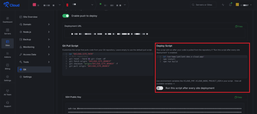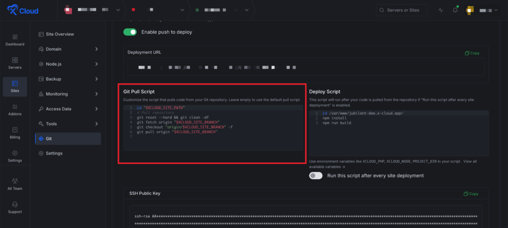 The Git Pull Script allows you to control how the code is fetched from your Git repository during deployment. You can go to the โGit Pull Scriptโ section and enter your custom script. If you leave this field empty, xCloud will use the default pull process.
