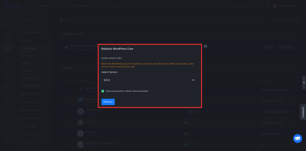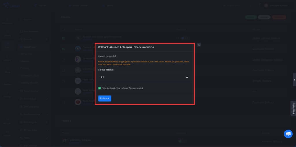 You can also roll back to your preferred version. Click on the rollback option, choose your desired version, enable the backup option, and then click โRollback.โ