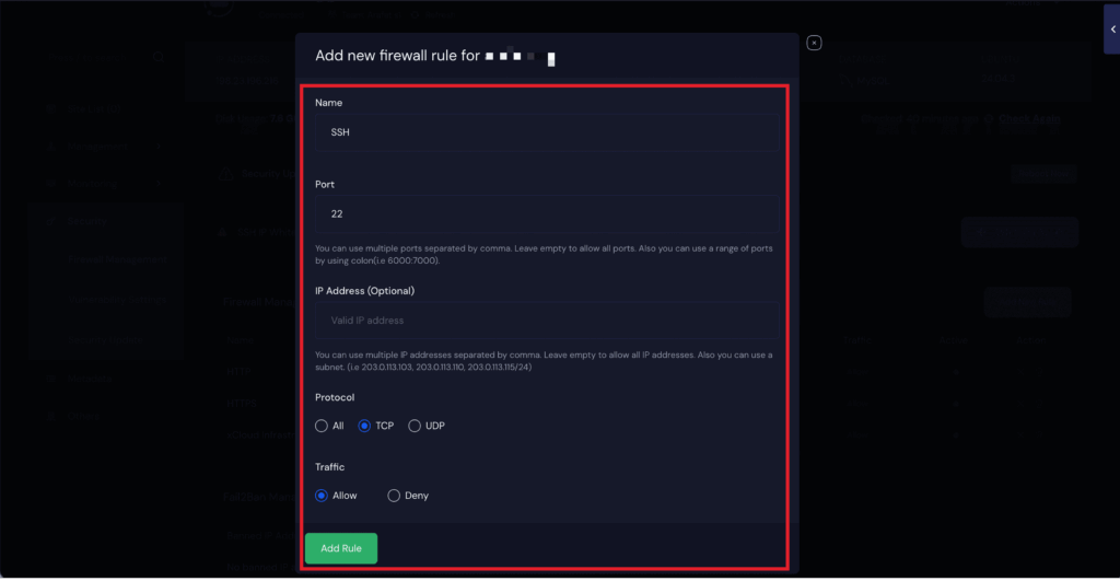 In the ‘IP Address‘ field, you can specify a particular IP address to whitelist it, or leave the field blank to allow SSH access from all IP addresses. Next, set the ‘Protocol’ to ‘TCP’ and configure ‘Traffic‘ as ‘Allow’. Once all details are entered, click ‘Add Rule’ to apply the changes and restore SSH access to your server.