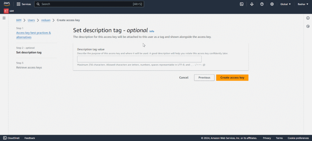Now give a Description Tag to proceed to create an access key. Once the access key is created copy the Access Key and Secret from here and go back to your xCloud Dashboard to integrate the server with xCloud.