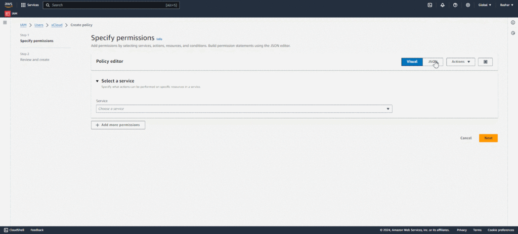 Click on the โJSONโ button from the Policy Editor and paste the below given JSON code in the editor. Finally, tap on the โNextโ button.