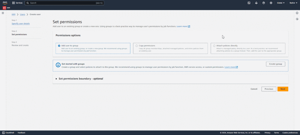 You have three options to set permissions for the new user. The first one is โAdd user to groupโ which lets you add the user to an IAM group with predefined permissions, which is efficient for managing multiple users with similar access needs. The second one is โCopy permissionsโ which enables you to duplicate the permissions of another IAM user. And the final policy โAttach policies directlyโ allows you to assign AWS-managed policies or custom policies.