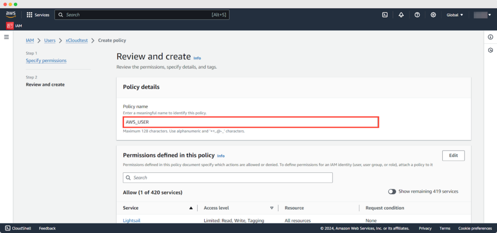 Once the policy is created for Lightsail instance, give the policy a name and hit on the โCreate Policyโ button.