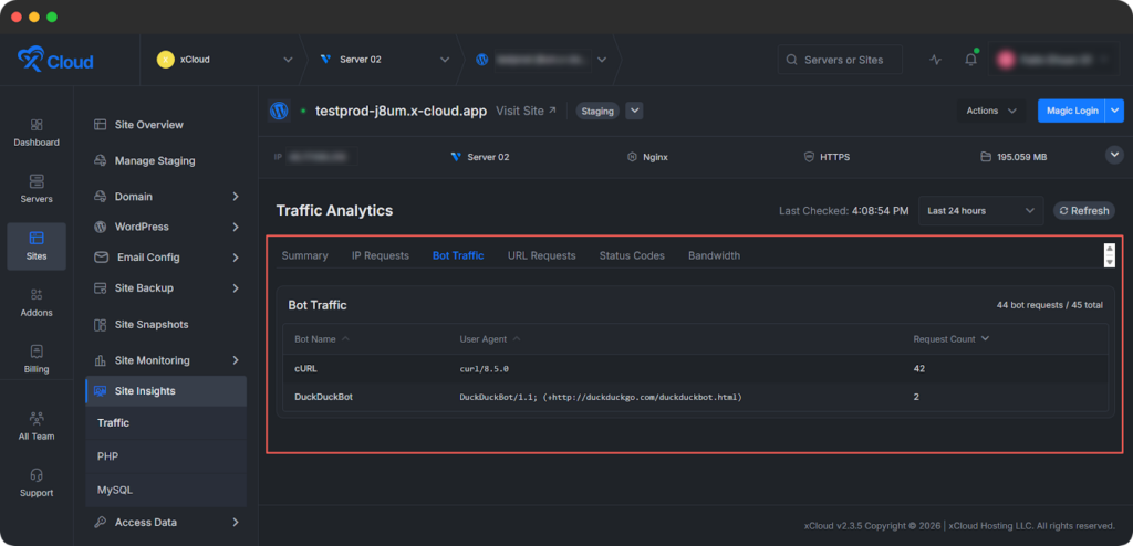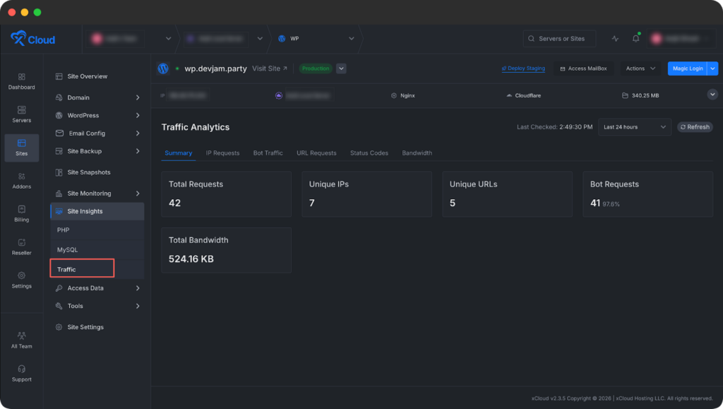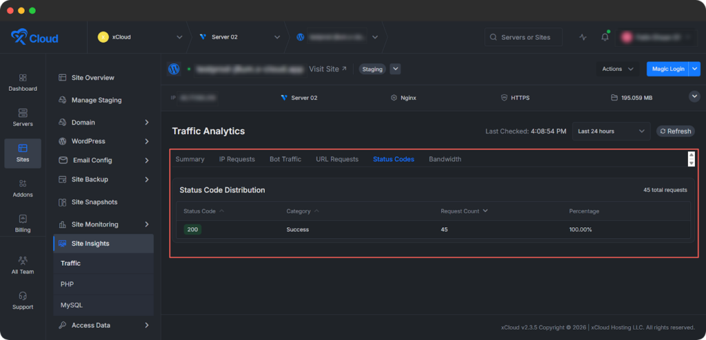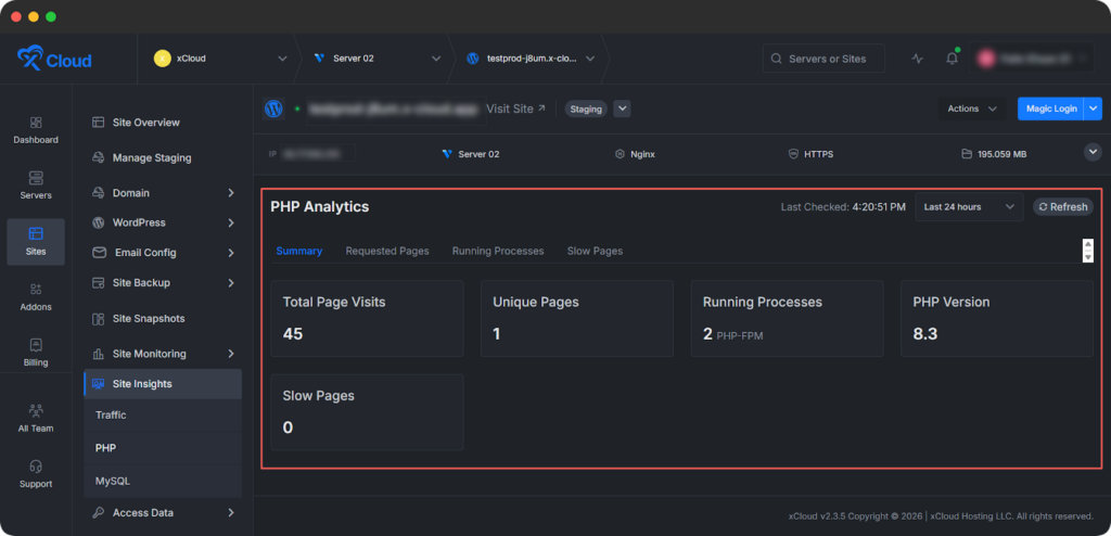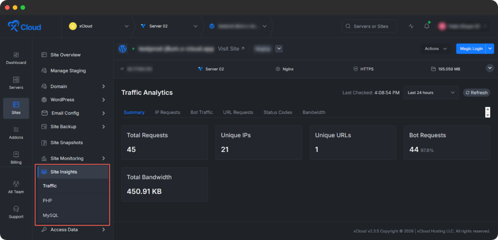 Follow the steps below to access Site Insights from your xCloud dashboard and learn how to read the PHP, MySQL, and traffic reports to monitor, diagnose and improve your websiteโs performance: