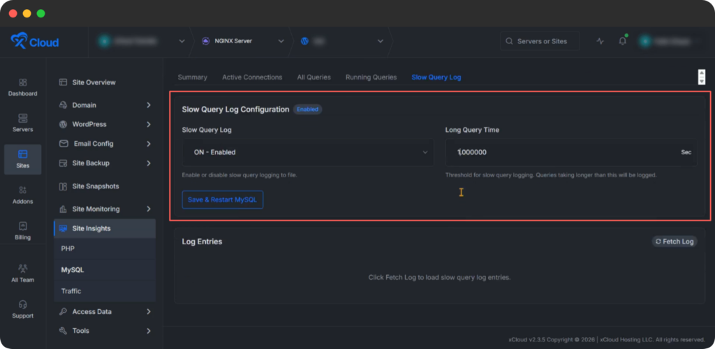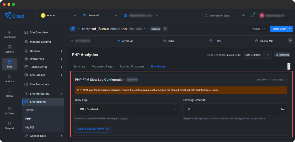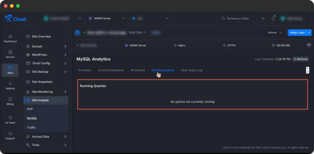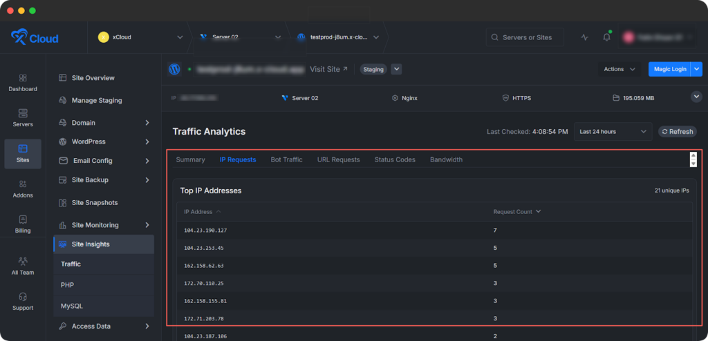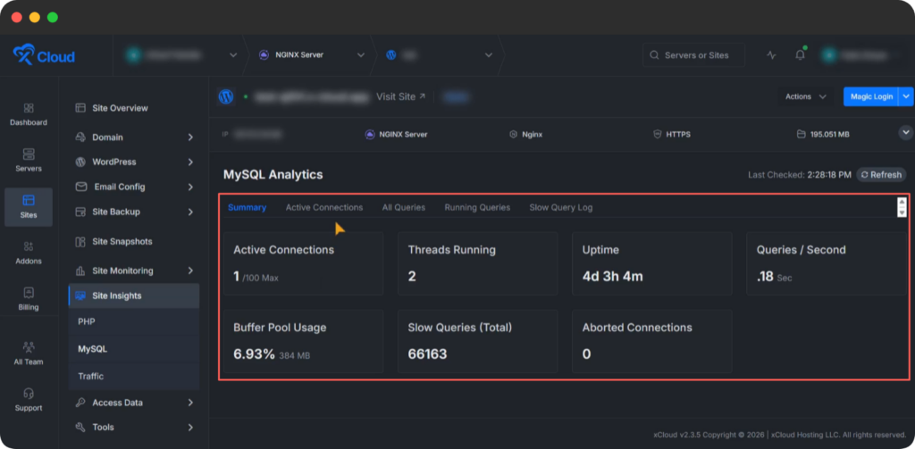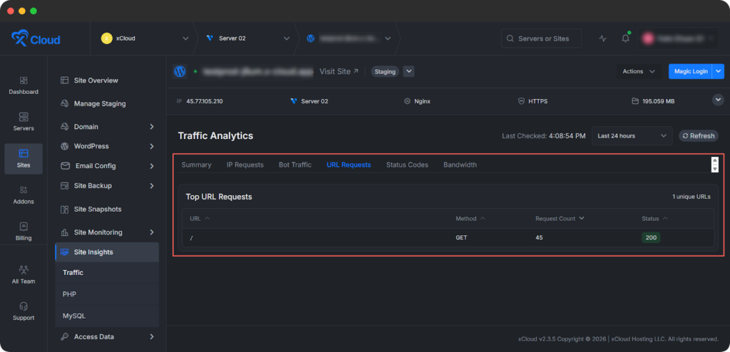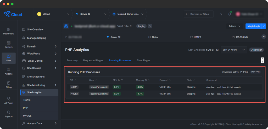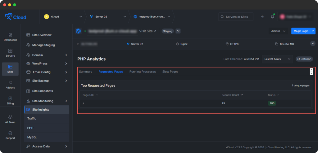 Log in to your xCloud account. From the dashboard, go to โSitesโ and select your site. Navigate to Site Insights in the sidebar menu, then click one of the three tabs: PHP, MySQL or Traffic. Use these tabs to view detailed performance data for your site.