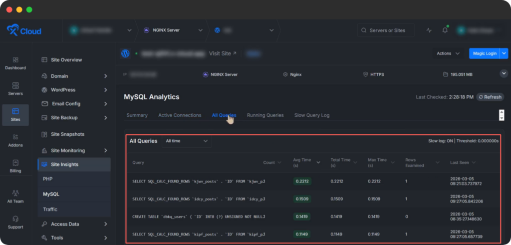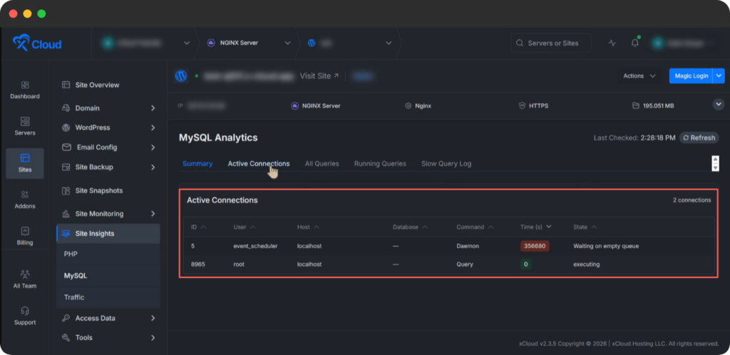 Use MySQL Insights to see how your database handles live queries and connections. This is where you detect bottlenecks, slow queries, and configuration issues that can slow down your entire application stack.โ