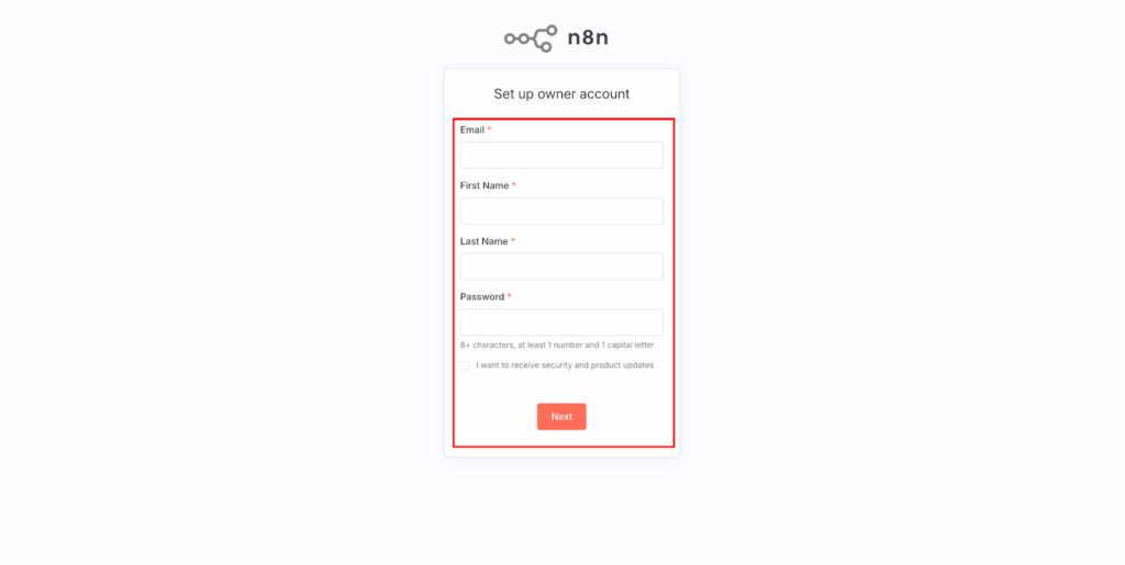 This will open the n8n dialog window for registration, which should look something like the example below. Simply enter your details and create a password according to the specs indicated. Hit the โNextโ button, then click through any additional popups, leaving them empty for now.