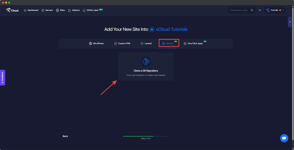 Next, you will see options such as โWordPressโ and โCustom PHPโ. Go to the โNode.jsโ option from the tab. After that, choose the โChoose a Git Repositoryโ option to import your Node.js application using a Git provider.