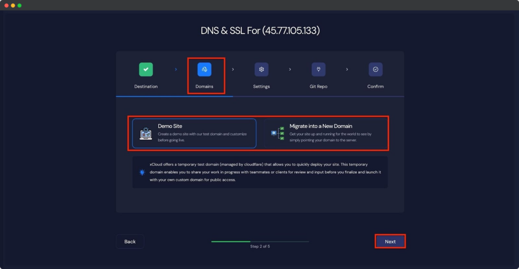 The โDomainsโ tab allows you to configure your siteโs domain. You can either create a โDemo Siteโ or a โLive Siteโ. For this documentation, weโll proceed with the โDemo Siteโ option and click โNextโ to continue.